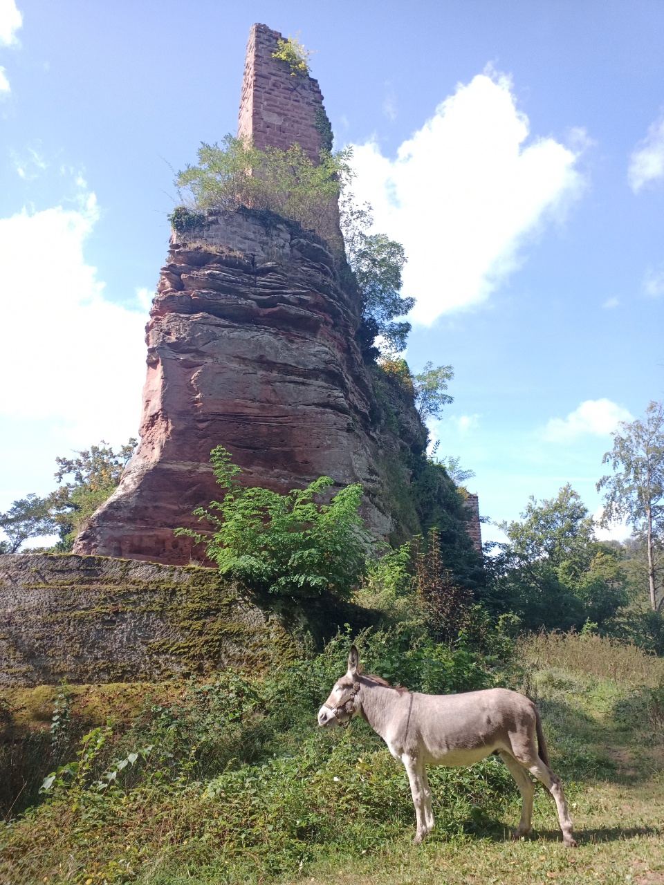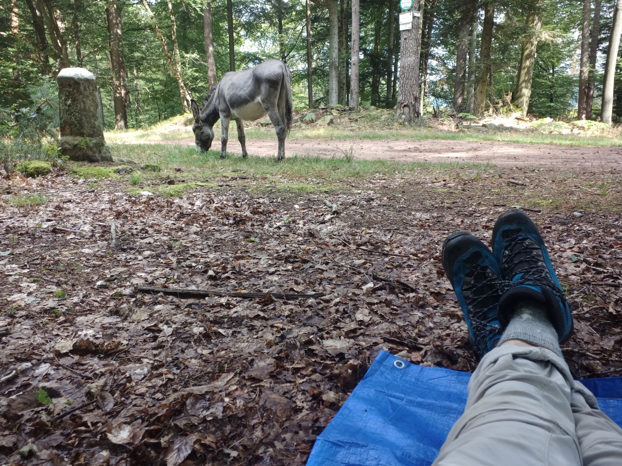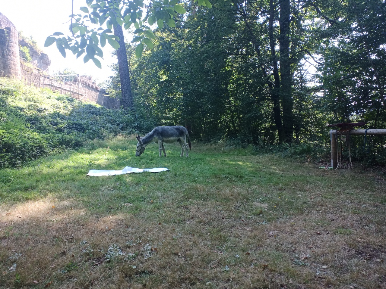 Nachdem es dann auch unter dem Baum regnete, entschloss ich mich weiter zu laufen….laut App sollte es ohnehin noch etwas weiter regnen…aber es war auch kein heftiger Regen ….also mit etwas Anlaufschwierigkeiten ging es weiter und es folgte dann bald nach dem Regen die erste Pause mit Gepäck und später nochmal eine ungesattelte Pause….beim Loslaufen war Dali dann bockig und zog zurück…versuchen kann man es ja Mal…war ja ein schöner Platz zum grasen …aber dann hat er irgendwann nachgegeben….und es ging weiter zu einer Burgruine….der Weg wurde immer steiler und wilder….ich prüfte dann stellenweise auf Eseltauglichkeit und setzte für eine Umrundung der Ruine an…und Dali zog durch….braver Esel …. anschließend konnte er dann grasen, bevor wir uns an den Abstieg machten …..der restliche Weg war relativ einfach… ein Höhepunkt war eine Amsel, die plötzlich neben uns unter Piepsen hoch flog und Dali etwas aufschreckte…ich dachte den ganzen Tag noch, dass Dali gar keine Anstalten machte, Mal irgendwann wie von Joël angemerkt, loszurennen….als es dann etwas bergab ging, drehte er tatsächlich plötzlich auf und fing an schnell loszurennen…damit hatte ich gar nicht mehr gerechnet….konnte ihm aber gerade noch mit dem mitgeführten Stock, den ich dann neben seinem Kopf hin und her schwenkte, stoppen…puhh …ein losrennenden Esel am Seil festzuhalten, ist eher weniger aussichtsreich…..dann noch kurzer Nervenkitzel an einer Pferde Umzäunung, mit mehreren Pferden darin ….hat Dali aber toll gemeistert und die Pferde waren auch entspannt….kurz darauf waren wir auch schon am Esel Zuhause angekommen…als ich Dali dann zu seiner Familie ließ und mich auch weiter machte, war es so 17h….Joël war noch nicht da ..ich schrieb ihm eine SMS ….hat er hoffentlich bekommen…. erfahren werde ich dann morgen…. anschließend noch einkaufen und zum Campingplatz….dort in der Gastronomie einen Flammkuchen und Salat togo bestellt und am Zelt verdrückt (Nachtisch gab es vom Supermarkt)…zum Glück hat es dann da nicht mehr geregnet…. bin gespannt, wie das Wetter morgen wird…