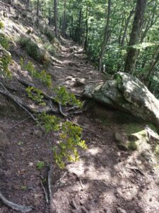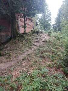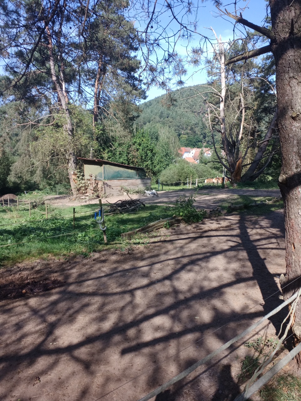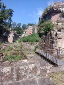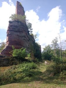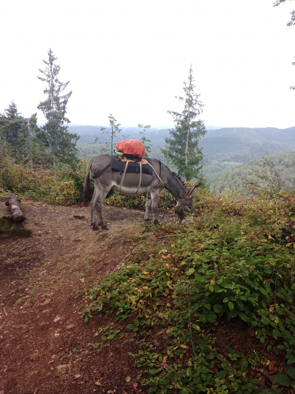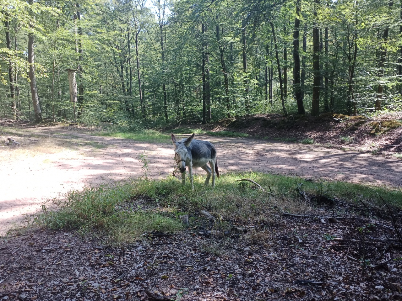 Nachdem es dann auch unter dem Baum regnete, entschloss ich mich weiter zu laufen….laut App sollte es ohnehin noch etwas weiter regnen…aber es war auch kein heftiger Regen ….also mit etwas Anlaufschwierigkeiten ging es weiter und es folgte dann bald nach dem Regen die erste Pause mit Gepäck und später nochmal eine ungesattelte Pause….beim Loslaufen war Dali dann bockig und zog zurück…versuchen kann man es ja Mal…war ja ein schöner Platz zum grasen …aber dann hat er irgendwann nachgegeben….und es ging weiter zu einer Burgruine….der Weg wurde immer steiler und wilder….ich prüfte dann stellenweise auf Eseltauglichkeit und setzte für eine Umrundung der Ruine an…und Dali zog durch….braver Esel …. anschließend konnte er dann grasen, bevor wir uns an den Abstieg machten …..der restliche Weg war relativ einfach… ein Höhepunkt war eine Amsel, die plötzlich neben uns unter Piepsen hoch flog und Dali etwas aufschreckte…ich dachte den ganzen Tag noch, dass Dali gar keine Anstalten machte, Mal irgendwann wie von Joël angemerkt, loszurennen….als es dann etwas bergab ging, drehte er tatsächlich plötzlich auf und fing an schnell loszurennen…damit hatte ich gar nicht mehr gerechnet….konnte ihm aber gerade noch mit dem mitgeführten Stock, den ich dann neben seinem Kopf hin und her schwenkte, stoppen…puhh …ein losrennenden Esel am Seil festzuhalten, ist eher weniger aussichtsreich…..dann noch kurzer Nervenkitzel an einer Pferde Umzäunung, mit mehreren Pferden darin ….hat Dali aber toll gemeistert und die Pferde waren auch entspannt….kurz darauf waren wir auch schon am Esel Zuhause angekommen…als ich Dali dann zu seiner Familie ließ und mich auch weiter machte, war es so 17h….Joël war noch nicht da ..ich schrieb ihm eine SMS ….hat er hoffentlich bekommen…. erfahren werde ich dann morgen…. anschließend noch einkaufen und zum Campingplatz….dort in der Gastronomie einen Flammkuchen und Salat togo bestellt und am Zelt verdrückt (Nachtisch gab es vom Supermarkt)…zum Glück hat es dann da nicht mehr geregnet…. bin gespannt, wie das Wetter morgen wird…