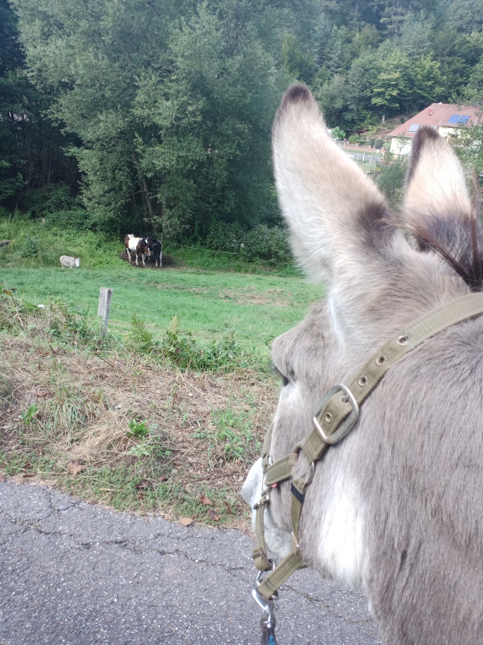 Neuer Tag, neuer Esel 🙂. Sein Name ist Hop. Heute stand eine schöne Rundtour mit zwei Burgruinen an ….ca 11 Kilometer…also genug Zeit zum Pausieren….die bekam Hop auch … insgesamt lief es gut … Ausreißer gibt es wohl immer ….Interessant wurde es, als ein großer Baum unseren Weg versperrte….wie mussten dadurch einen kleinen Umweg durch den Wald nehmen ….vor dem Baum ging es etwas steil nach oben …und Hop wollte erst nicht …dann habe ich eine andere Stelle ausgewählt und mit Anlauf ging es hoch .. hmm …ja …aber irgendwie und irgendwann mussten wir auch wieder auf den Weg zurück…..und das war dann noch etwas steiler….aber Hop stupste mich schon von hinten ….ich führte ihn dann langsam auf den Weg runter und er hat das gut gemeistert …und einmal wusste er schon eher als ich welcher Weg der Richtige ist 😁…dann etwas später kam eine Baustelle mit viel Lärm und vielen Bauarbeitern….das hat ihn verschreckt und er wollte schon flüchten…wovon ich ihn noch abhalten konnte….ich habe ihn dann die Situation aufnehmen lassen und ihn zum Laufen motiviert….aber er wollte da nicht vorbei….ok….dann lasse ich ihm mehr Zeit…da kam einer der Bauarbeiter an Hop seitlich hinten ran und konnte ihn zum weiterlaufen bewegen….so einfach 🙂….kurz vor dem Esel Zuhause kamen wir an einer Koppel vorbei in der auch ein einzelner Esel stand….das war für die beiden sehr interessant …aber eine Zusammenkunft war leider nicht vorgesehen….also nach einem kleinen sich anschauen Päuschen ging es dann weiter…