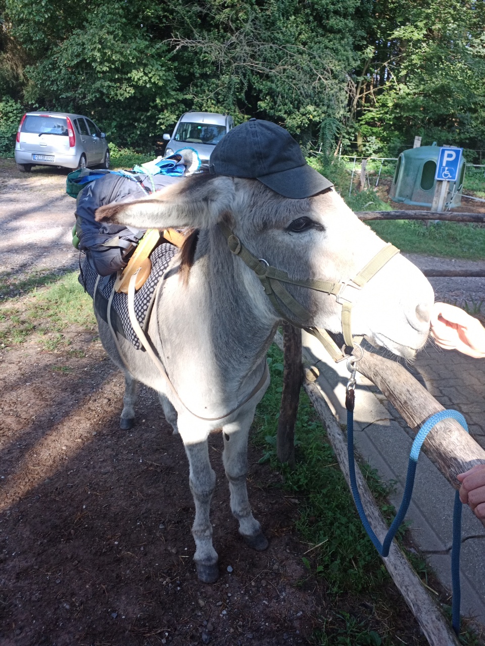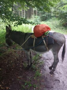 Nach dem Hufen Auskratzen und dem Aufsatteln ging es los …. Anfangs wollte Dali nicht so richtig…. ließ sich aber dann doch darauf ein von seinem Zuhause fortzulaufen….vor uns ist eine Reiterin vom Hof geritten….das Esel Zuhause ist direkt an einem Reiterhof ….allzu weit kamen wir erstmal nicht….es fing an zu regnen an und wir suchten etwas Schutz unter einem Baum …ich hatte zwar eine große Plane als Regenschutz dabei, entschied mich aber dafür nur den Rucksackschutz rauszuholen….die Plane ist eher dafür, wenn mehr Gepäck auf dem Sattel liegt…..als wir da so standen, hörte ich ein paar Meter weiter ein Pferd, dass durch uns aufgeschreckt wurde und flüchten wollte….es war die Reiterin, die vor uns den Hof verließ und wohl aufgrund des Regens wieder umkehrte….sie hatte ordentlich zu tun, um das Pferd, auf dem sie saß, zu beruhigen…sie stieg ab und wollte wohl etwas näher kommen, aber ihr Pferd scheute und zog die junge Frau an der Leine mit einem Ruck zurück….puhh…das war ihr wohl auch zuviel und sie schlug den Rückwärtsgang ein, um uns zu umlaufen…das wird wohl allen im Gedächtnis bleiben, außer Dali, der dabei relativ entspannt war….aber wenn Esel auf Pferde treffen, sollte man schon generell aufpassen….man weiß nie, wie beide Seiten reagieren….wenn ich an einer Pferde Umzäunung vorbeikomme, bemerken Esel und Pferd sich relativ schnell und der Esel bleibt für gewöhnlich stehen und ich lasse die Situation auf ihn wirken und sie einschätzen….dann motiviere ich ihn weiterzulaufen….manchmal kommen die Pferde näher….manchmal stehen sie auch nur und beobachten….