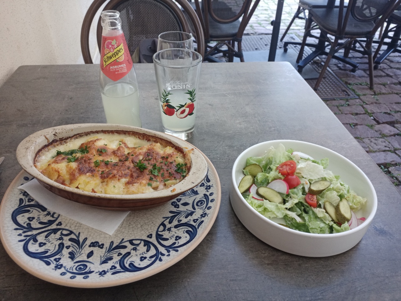 Gestartet bin ich früh….und konnte meine Altstadtrunde schon gegen 9.30h beginnen….und das war gut ….die Gassen waren noch relativ leer ….und ich dachte noch, ob hier die Saison schon vorbei ist …aber gehen 11h wurde es doch dann merklich voll in den Gassen und auf den Parkplätzen….ich habe mir dann auch hier direkt ein Zimmer genommen und werde den Tag hier verbringen. Heute hatte ich das leckerste Essen während meinem Urlaub….das ist schön, denn es wird schon bald wieder nach Hause gehen …und das ist zum Ende hin nochmal ein schöner Abschluss…. kulinarisch war ich nämlich bisher noch nicht so wirklich abgeholt….auch nicht mit regionalen Spezialitäten…aber das lag eher nicht an den Spezialitäten selbst, sondern eher an der Zuberet…. heute war ich in einem kleinen Restaurant….und es hat wirklich alles gestimmt….von der Bedienung, die freundlich und aufmerksam war, bis zum Essen…der mit Münster Käse überbackene Kartoffel-Speckauflauf war sehr lecker….der Salat war auch toll …und die Crème brûlée wurde am Tisch flambiert….damit hatte ich so gar nicht gerechnet….ich schätze, da muss dann irgendein Alkohol im Spiel gewesen sein….obwohl die ja eigentlich ohne Alkohol sein müsste …aber geschmeckt hatte ich keinen Alkohol…..wird wohl ein Mysterium bleiben….