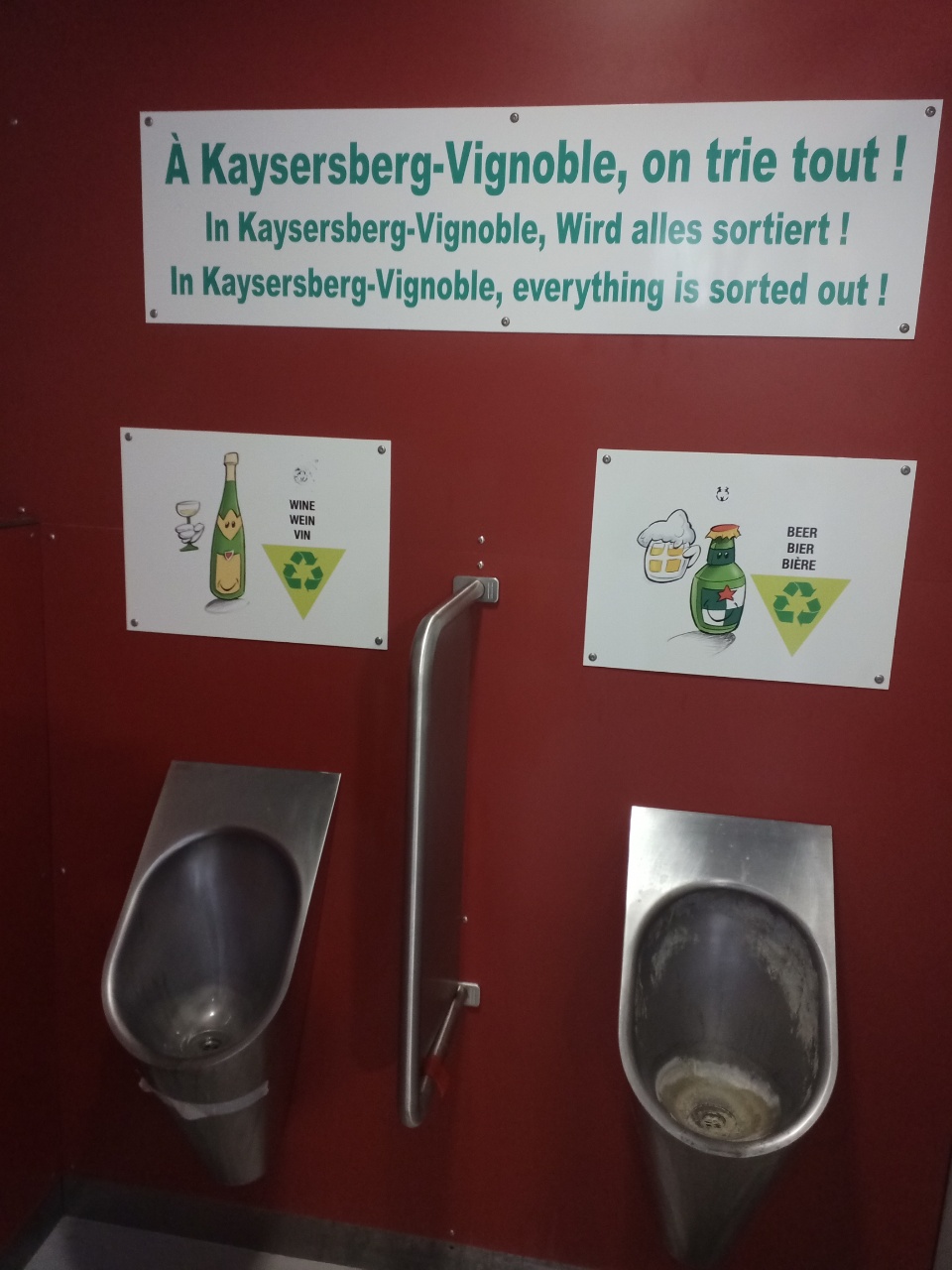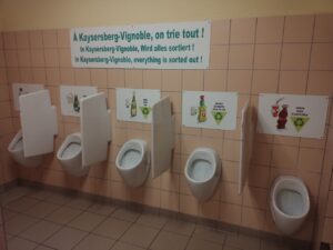 Die Kayersberger sind ja lustig….bei den Urinalen ein Schild bezüglich „Sortierung“ hinzuhängen (siehe Fotos)…..das hat mich ganz schön in Bedrängnis gebracht…die hingen anscheinend auch noch auf allen öffentlichen Toiletten… ich hatte ja zum Frühstück Kaffee….aber dafür gab es anscheinend kein Urinal…..also einhalten oder illegale Abwasserentsorgung? Dann Letzteres eben und in ein anderes Urinal damit, wird schon nicht auffallen ….😉😁🤓….und die, die Cola trinken, sind automatisch kleiner?! 😄