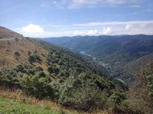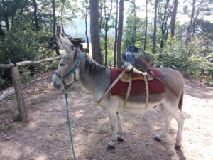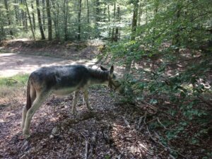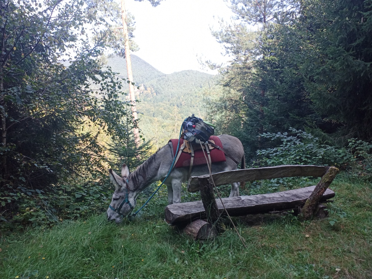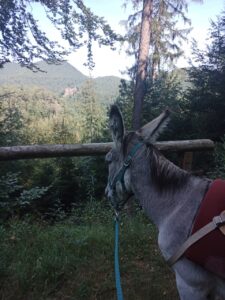 Ich wählte mir für den ersten Tag die kürzeste Tour aus….bei komoot hat die Eselvermietung diverse Touren von A nach B sowie Rundtouren eingestellt….insgesamt lief es heute gut… Gavroche blieb öfters Mal kurz stehen, weil er irgendwas bemerkt hatte oder zum Naschen….aber es gab keine großen Probleme ihn zum Gehen zu bewegen….ich ließ ihm gerade am Anfang Zeit zum Anlaufen und habe auch ausreichend Fresspausen eingelegt…. natürlich, wenn man Gavroche fragen würde, waren die natürlich zu kurz…bei einem schönen Ausblick vom Berg in die Ferne blieb er oft stehen und schaute ..oder graste…. entweder fand er es tatsächlich schön, oder er konnte dort in der Vergangenheit bei den meisten Touren eine Pause einlegen, während die Esel-Führer den Ausblick genossen….er sorgte heute gerne dafür, dass um die Sitzbank das Gras nicht so hoch war 😉