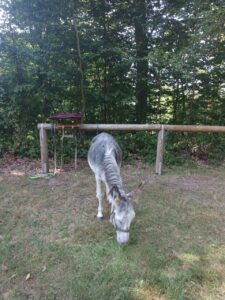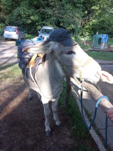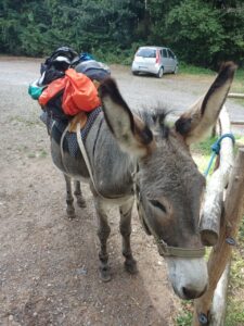 Ziemlich pünktlich war ich dann bei den Eseln…es gab für jeden etwas Karotte und für meinen Wegbegleiter hatte ich für später noch einen Apfel dabei….Joël sagte mir, dass er mir heute lieber einen anderen Esel mitgeben möchte, da er nicht sicher ist, ob Gavroche fit ist….er hätte sich heute Morgen etwas anders verhalten…..