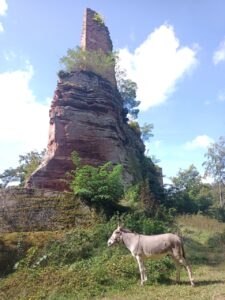 Na klar….safety first …. besser erstmal zu Hause lassen und beobachten….also dann einen anderen Esel….ich wollte schauen, wer Lust hat …einer kam neugierig ans Gatter und ließ sich gerne streicheln ….ich ging dann mit dem Halfter zu den Eseln, zeigte es, rief und wartete….dann kam der gleiche Esel wieder und ließ sich das Halfter anlegen… Entscheidung gefallen….Chili…das ist sein Name und er ist 11 Jahre….also los ging es…auf die 10Km lange Schöneck Rundtour mit zwei Burgen…auch Chili blieb öfter Mal stehen….kein Bock? Und er naschte auch öfter Mal wenn sich was Unwiderstehliches an Wegesrand anbot …alles in allem aber ok ….wir kamen an der ersten Burgruine vorbei….und waren noch gar nicht allzu lange unterwegs…also gibt es nach kurzem Aufenthalt direkt weiter…. kurze Zeit später sträubte er sich weiter zu gehen….ok… eigentlich wollte ich erst bei der Burg Schöneck eine längere Pause machen, aber wir hatten ja genug Zeit…..und dann gibt’s halt zwei längere Pausen…. schließlich bin ich ja vor allem wegen den Eseln hier….und einfach den Eseln beim grasen zuzuschauen ist schon eine prima Entschleunigung….als absatteln und Pause… vielleicht würde er dort immer noch sein …aber irgendwann musste ich ihn dann doch zum Gehen bewegen …wenn auch etwas widerwillig von seiner Seite….auf zur Burgruine Schöneck …dort wurde eigens für Pferde ein Haltebalken montiert, eine kleine Wiese zum grasen angelegt und ein Picknickplatz für die Reiter eingerichtet….also nix wie hin…. Chili wollte sich die letzten Meter dorthin nicht richtig bewegen…aber dann kamen wir an …. kurze Zeit später kam ein Mann, der hier an der Burg restauriert und wohl auch Führungen macht…er fragte, ob er für deren Homepage ein Foto von dem Esel machen darf… Pferde seien öfter dort, Esel seltener …